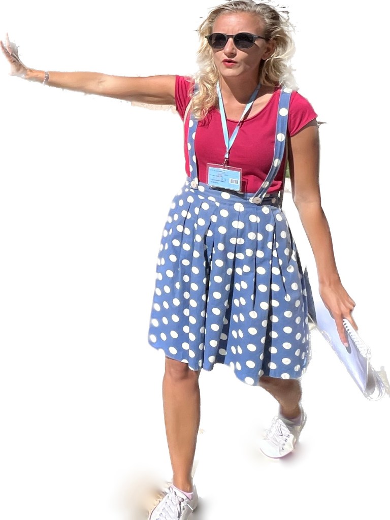 Martina was waiting as we approached the curb just outside the Pula Arena’s entrance. With her golden blond curls and dark sunglasses, Martina is Gwen Stefani incarnate. She wore a baby blue pleated skirt covered in white polka dots. Decorative suspenders framed a vibrant pink t-shirt.